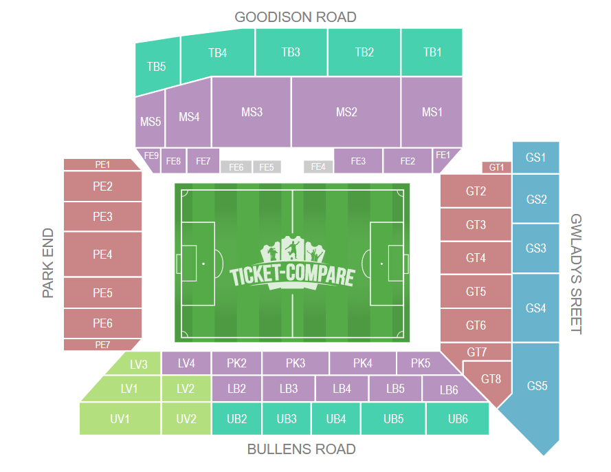 Le stade historique d’Everton FC, 39 414 places. Vue optimale de chaque zone pour un maximum de plaisir, que tu sois supporter local ou visiteur. Lieu d’histoire et de compétitions prestigieuses.