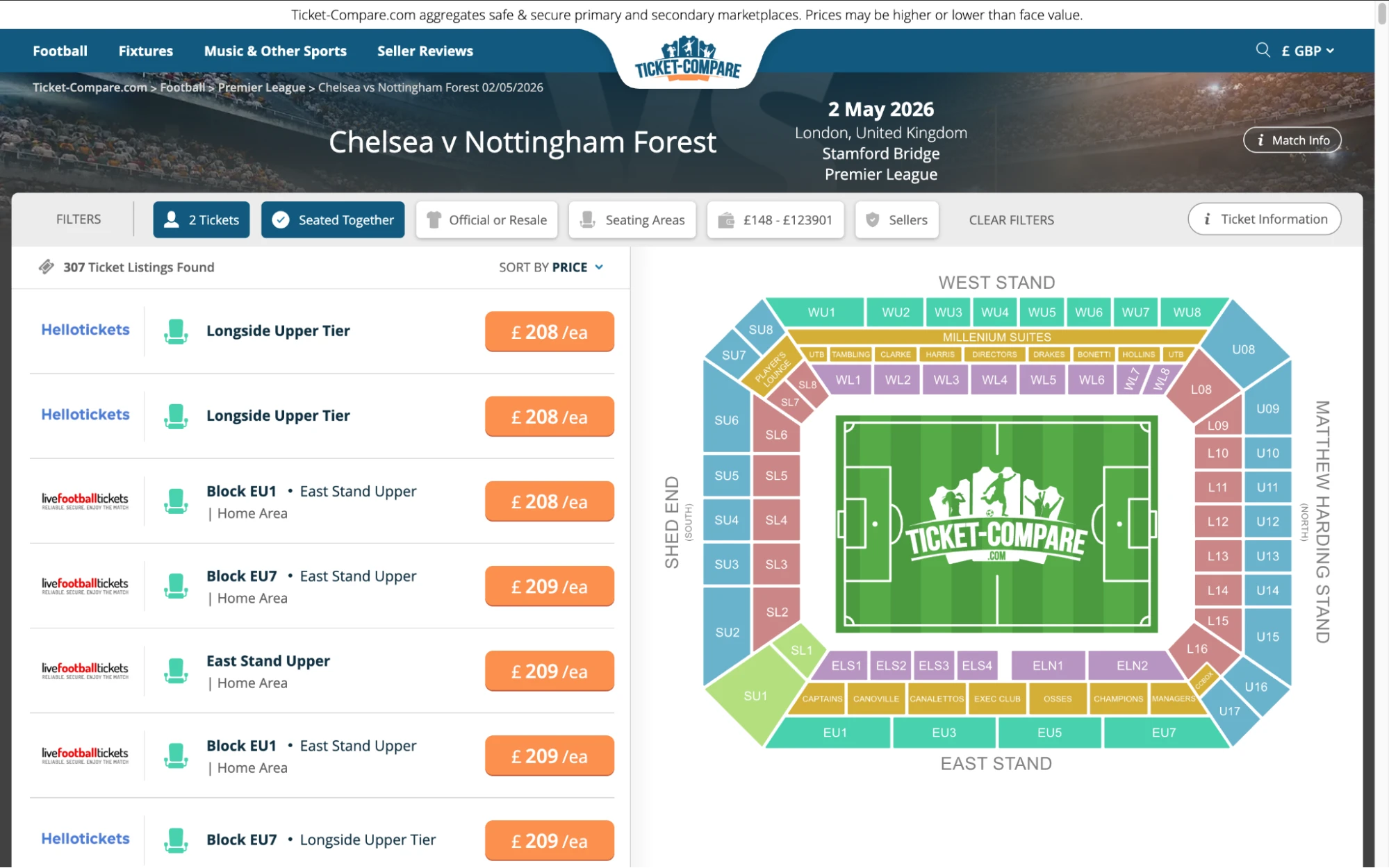 Ici, la plateforme Ticket Compare fait la différence : ce n’est pas un vendeur mais un comparateur listant les billets Chelsea de sites de revente certifiés et des partenaires hospitalité officiels.
